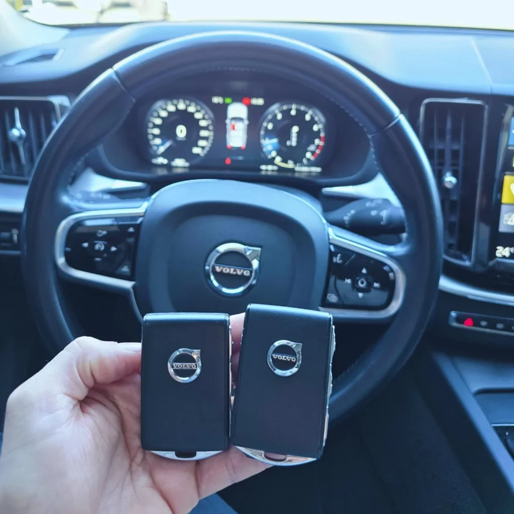 A imagem mostra duas chaves Volvo prontas para uso, já programadas e sincronizadas com o veículo. Esse tipo de serviço é essencial para quem deseja ter uma chave reserva ou precisa substituir uma chave perdida ou danificada.